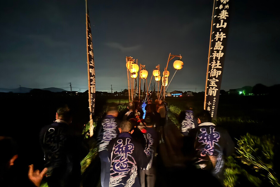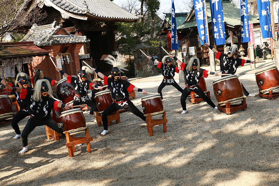 9月14日の杵島神社合祀の祭典、10月19日の妻山神社の例祭では、須古地区に伝わる浮立が奉納されている。15地区それぞれの浮立があり、神辺区浮立保存会は太鼓浮立を伝承。次の世代に引き継ぐため子ども浮立の指導にも積極的で、福祉施設への慰問活動にも取り組んでいる。今回披露する「道浮立」は、笛の合図で「静」から「動」に移っていくところは高揚感に包まれ見どころのひとつ。「上浮立」には「上の句」と「下の句」があり、表情の違いに注目を。