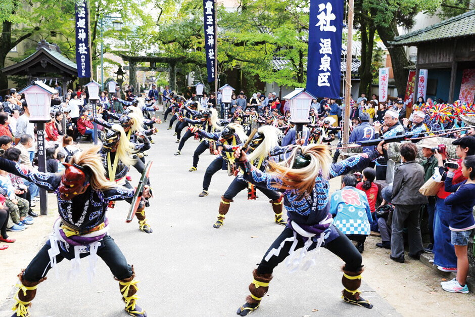 嬉野町温泉区に伝わる温泉区面浮立は、4年に一度、豊玉姫神社のお供日(毎年10月最終金曜日(お下り)の翌日)に奉納されている。その起源は不明だが、演目は9つあり、神輿のお供をして境内に入場する際の「奉願道」、神前で神様に鬼の力を誇示して戦いを挑む「神の前」、戦いに敗れた鬼が改心して舞う「よつばやし」を披露する。腰を低く落として踊り、腕を振り、足をあげ、激しく体を動かす勇壮さと、指先までピンと張りつめた感覚の動と静の所作を演目によって踊り分ける様は必見である。